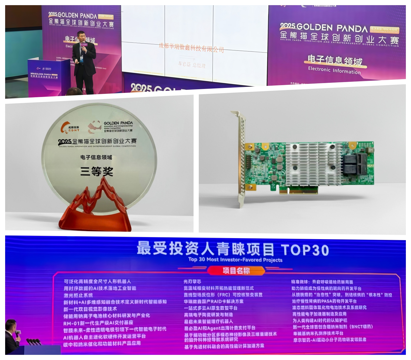 近日,2025 金熊猫全球创新创业大赛在成都高新区圆满落幕,华瑞数鑫的国产RAID卡项目从全球2317个参赛项目中脱颖而出,斩获电子信息赛道三等奖,并成功入选 “最受投资人青睐项目 TOP30”,成为数据存储国产化领域的亮眼标杆。