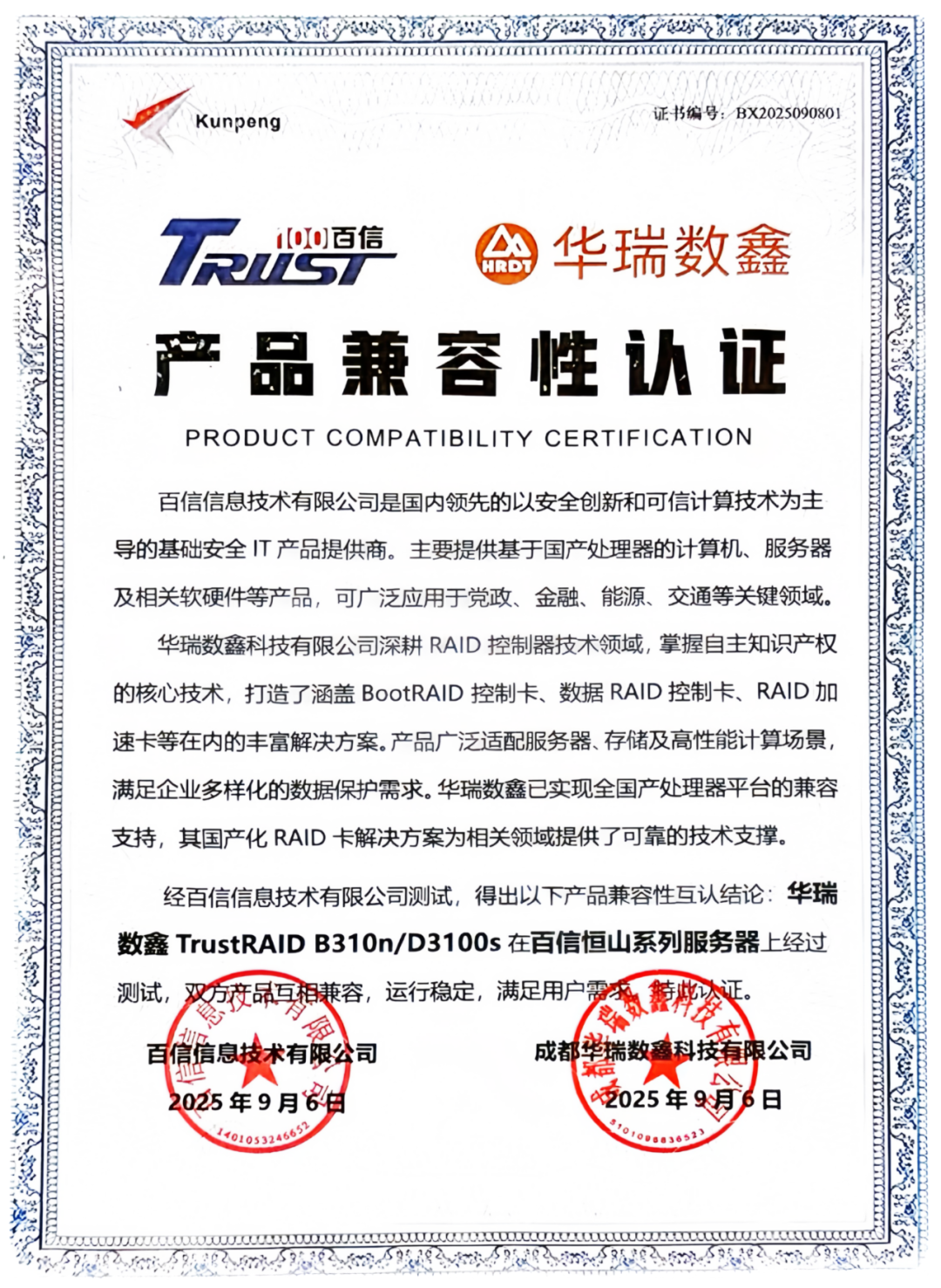 近日,成都华瑞数鑫科技有限公司(以下简称“华瑞数鑫”)TrustRAID B310n系统RAID控制卡和D3100s数据RAID控制卡与百信信息技术有限公司(以下简称“百信”)恒山系列服务器正式通过兼容性认证。经双方联合测试验证,双方产品在兼容性上表现优异,运行稳定流畅,可充分满足用户对系统数据安全性、可靠性的核心需求,同时保障系统整体运行的稳定性与高性能输出。