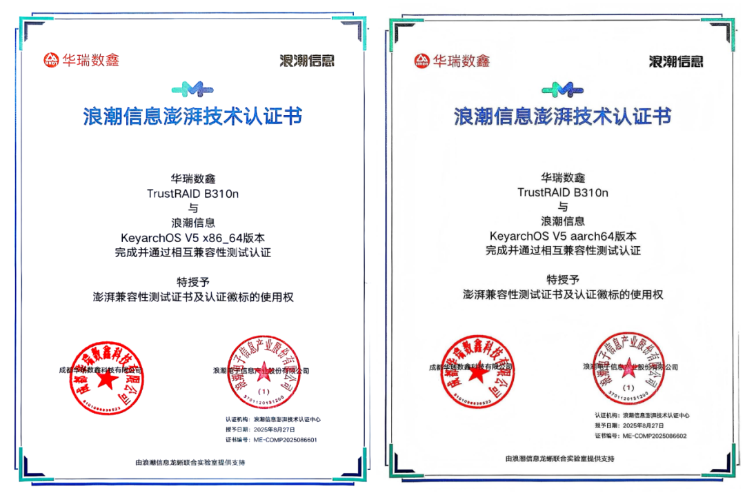 近日,成都华瑞数鑫科技有限公司(以下简称“华瑞数鑫”)TrustRAID B310n系统RAID卡,与浪潮信息服务器操作系统云峦KeyarchOS V5正式通过浪潮信息澎湃技术认证。经双方联合测试验证,两款产品在兼容性上表现优异,运行稳定流畅,可充分满足用户对系统数据安全性、可靠性的核心需求,同时保障系统整体运行的稳定性与高性能输出。